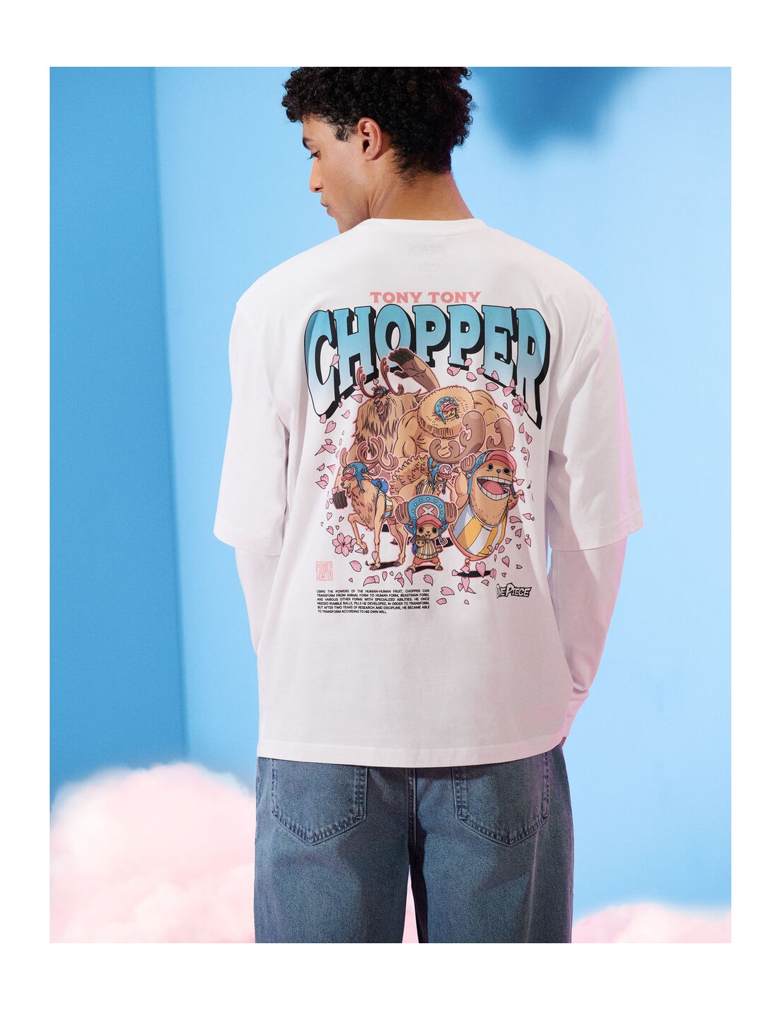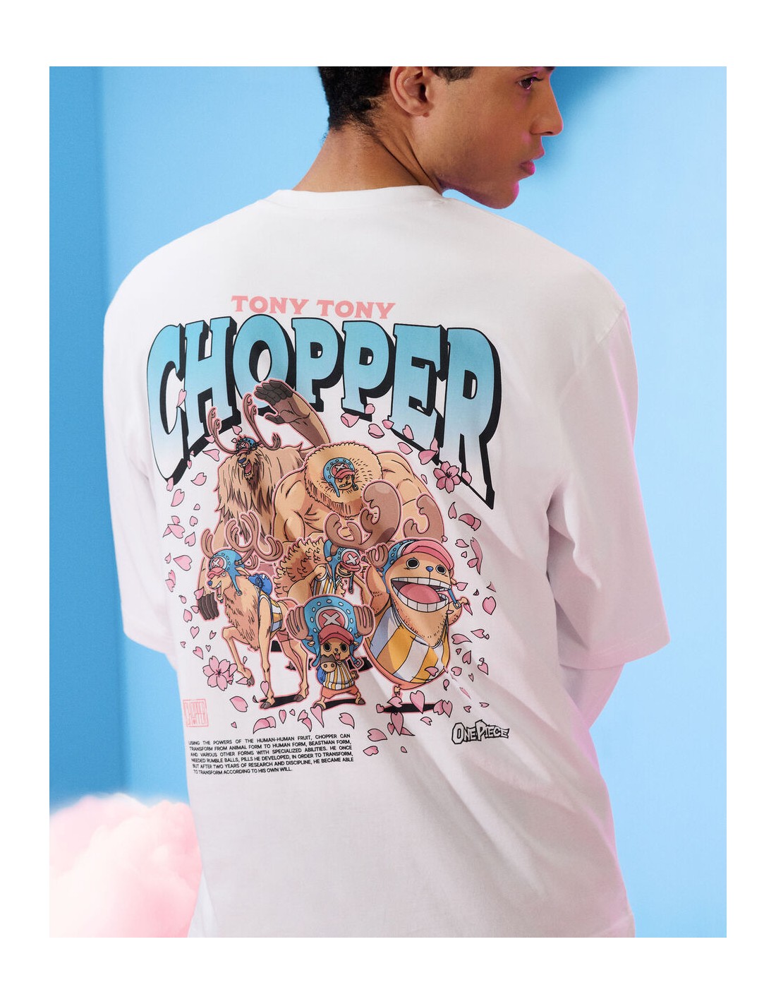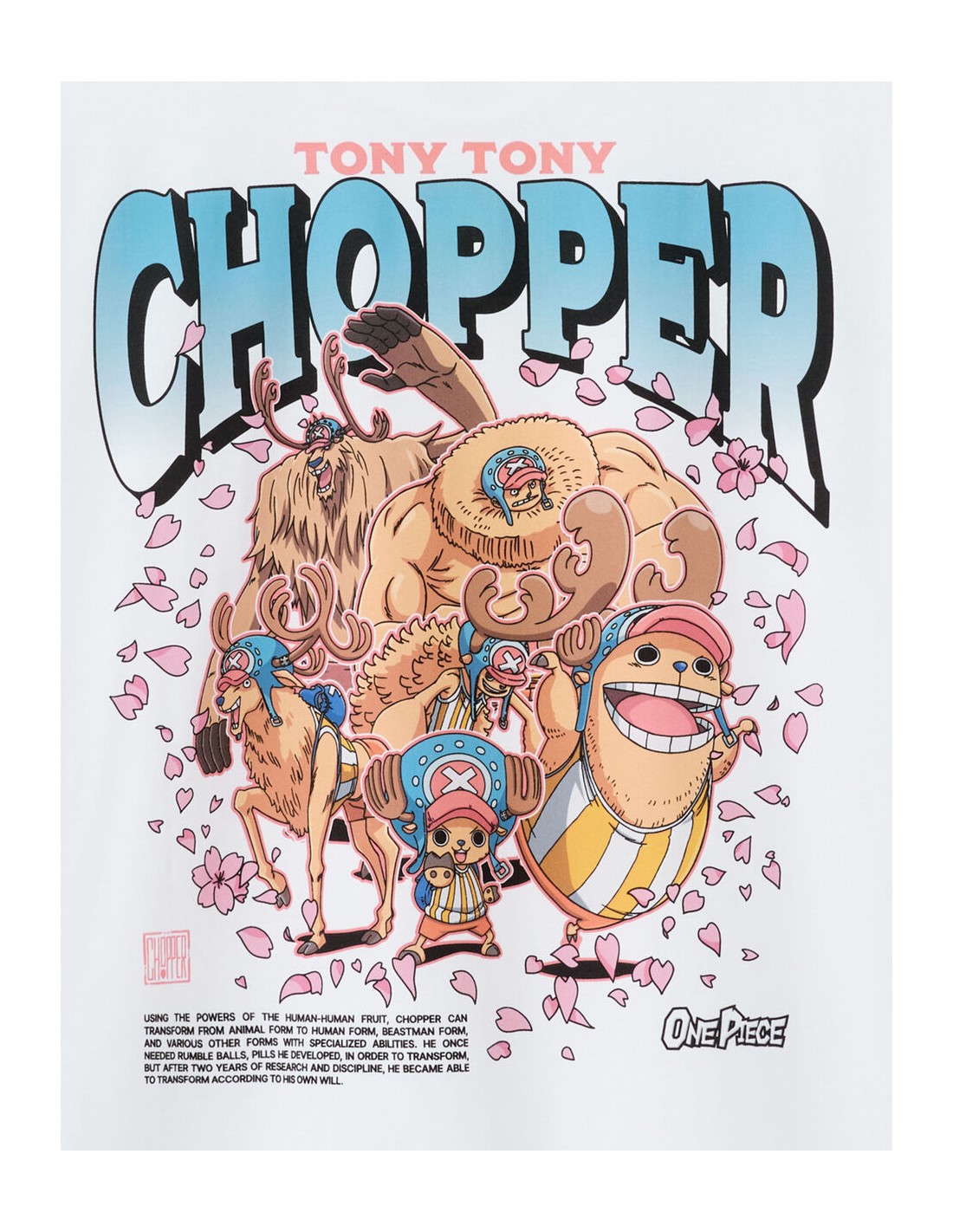 Membre de l’équipage de One Piece, Tony Tony Chopper est un renne ayant mangé le Fruit de l’Humain, ce qui lui a permis de parler, penser et se transformer. Médecin du navire, il est animé par un profond désir d’aider et de sauver des vies, malgré une grande sensibilité et une naïveté touchante. Pour l'homme qui se distingue par son originalité, ce T-shirt One Piece est un incontournable pour affirmer son style. - T-shirt blanc imprimé - 100% coton - Sur le devant, le personnage de Chopper est allongé sur un éventail constitué de fleurs de cerisier - Au dos du produit, il y a Chopper dans toutes ses transformations ainsi que des fleurs de cerisier, son prénom et le titre de l’animé One Piece, ainsi que le wording suivant en anglais : grâce aux pouvoirs du Fruit de l’Humain-Humain - Complétez votre tenue en l'associant à un T-shirt ou un sweat de notre collection.