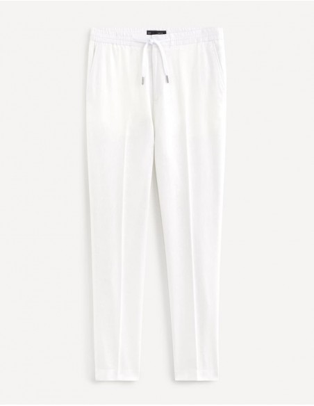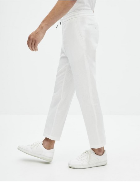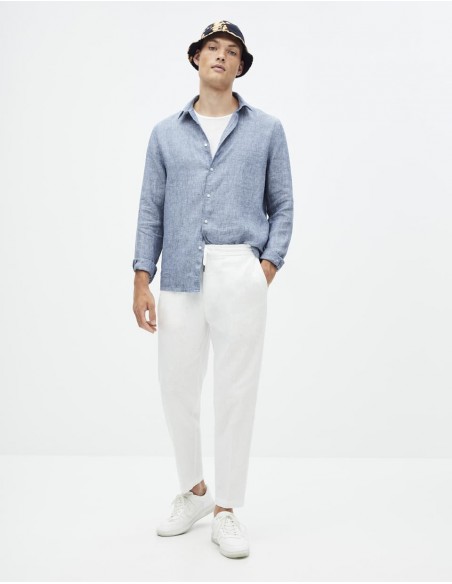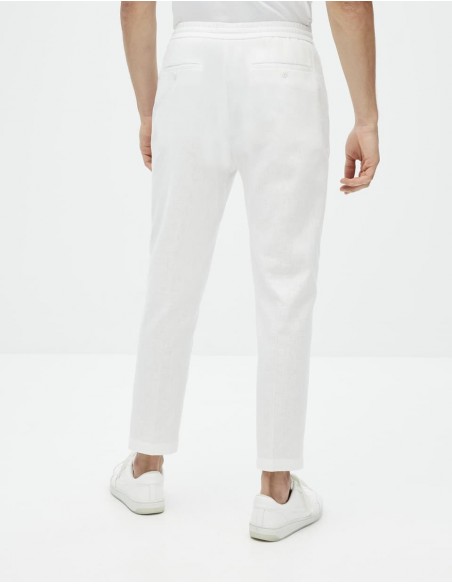 Le modèle par excellence de cette saison. Pantalon toile confectionné dans un tissu lin / coton. Sur un volume Coupe straight, taille élastique avec lien ajustable, deux poches italiennes sur les côtés et deux poches passepoilées à l'arrière, plis permanent.